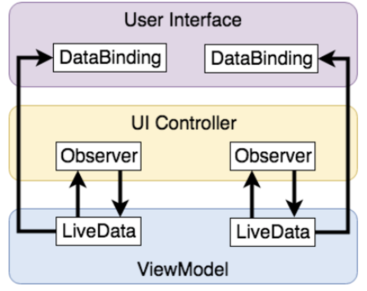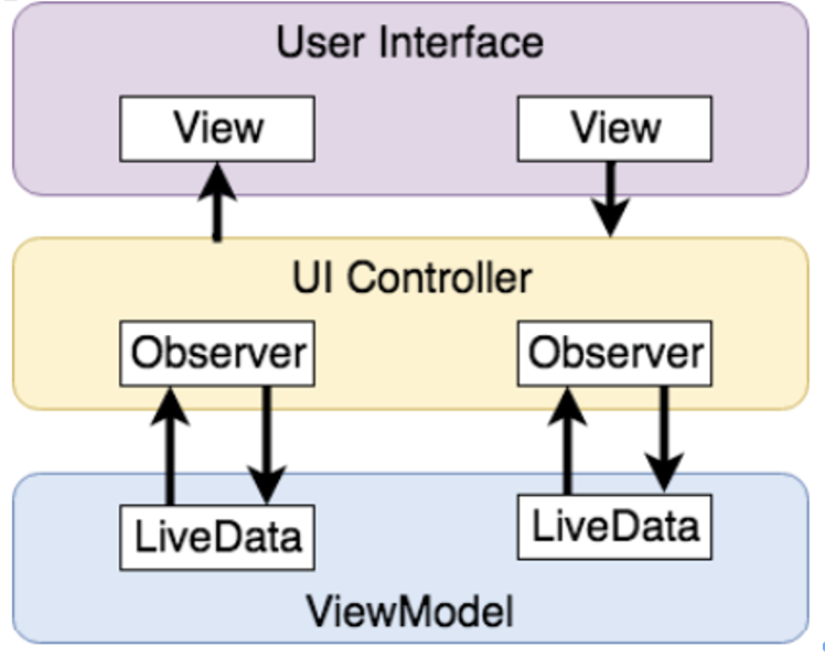 UI controller 내 observer가 있으며, ViewModel이 데이터를 변경하면 변경된 데이터가 있음을 observer를 통해 UI Controller에 알라게 됩니다. UI Controller는 변경된 데이터를 View에 전달하여 화면상에 update 하도록 합니다.
