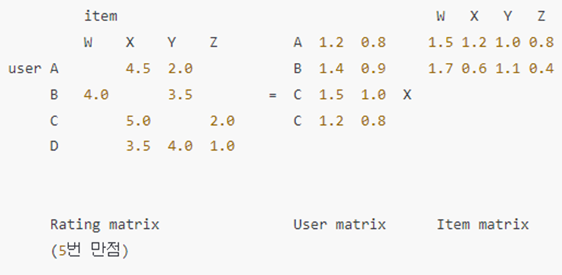 사용자 잠재요인 행렬(User matrix)과 아이템 잠재요인(Item matrix)행렬로 분해