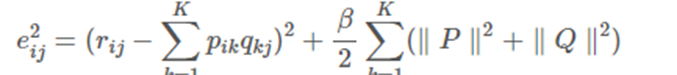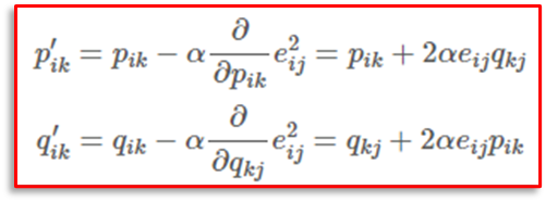 - P, Q 행렬로 예측 평점인 Rhat을 구하고 이와 실제 평점간의 오차를 구해 이를 줄이는 P, Q 값으로 갱신