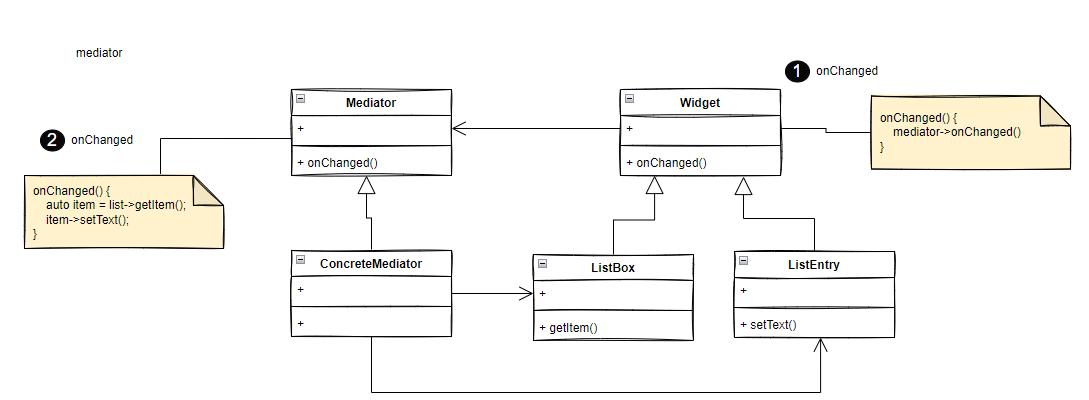 여러 concreate item 중 하나에서 어떤 event가 발생하여 다른 concreate item의 변화를 요청하고자 할때, 직접 요청하지 않고, base class인 Widget의 onChanged를 호출하여 Mediator에게 어떠한 변화가 있었는지를 알려줍니다.